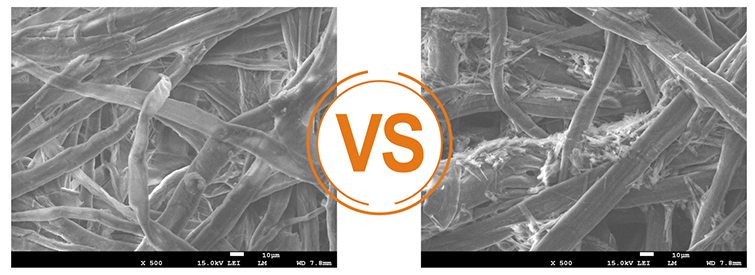500倍顯微鏡下:未噴涂荃芬產(chǎn)品的紙張 ; 500倍顯微鏡下:噴涂荃芬產(chǎn)品后